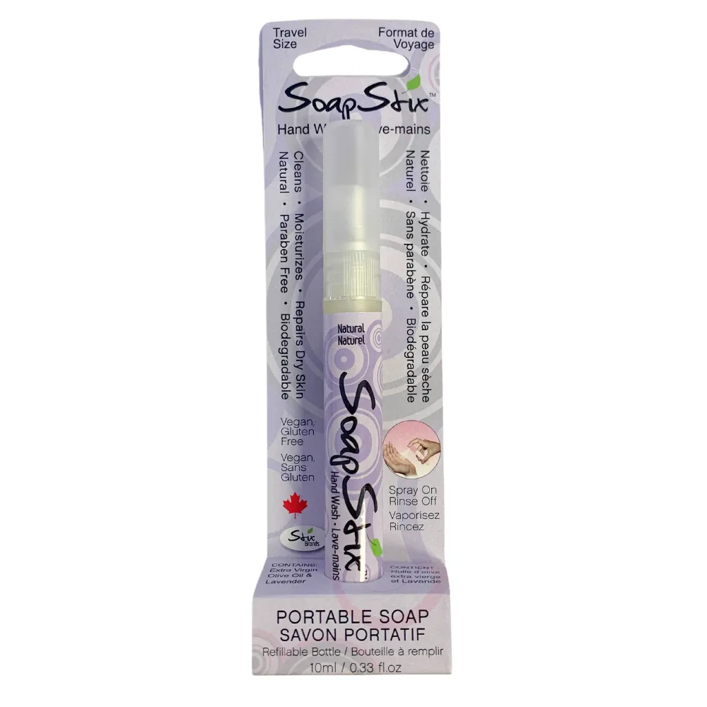 SoapStix Lavender Hand Wash spray gently cleans and rinses easily leaving skin smooth, refreshed moisturized. Made with all natural ingredients this beautiful hand soap is specially formulated for people with sensitive skin who suffer from dry skin and eczema. Avoid using harsh chemical based public soap dispensers and detergent soaps. Now you can wash hands with confidence anywhere with your own travel size SoapStix spray.